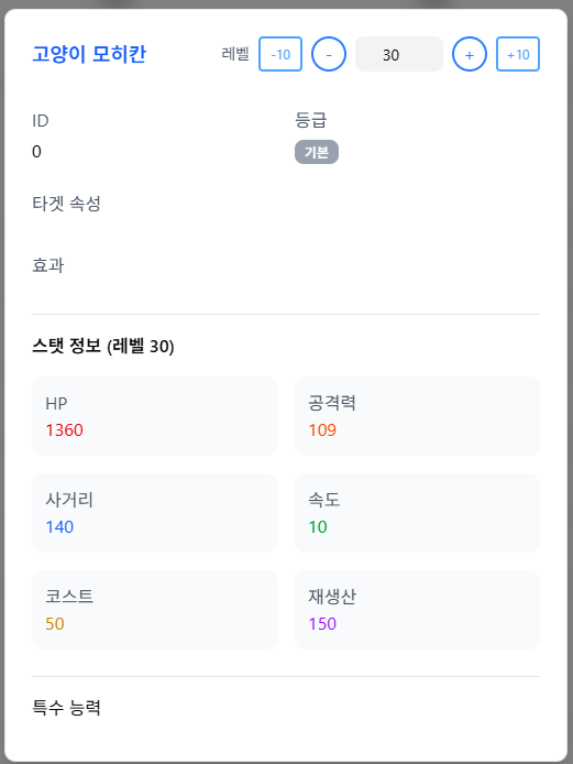 위와 같은 링크로 뒤에 캐릭터 아이디를 넣어 해당 캐릭터에 대한 페이지로 이동하실 수 있습니다. 캐릭터 ID는 bcu 데이터의 캐릭터 번호 그대로 넣었으며, 냥코DB 일본 사이트에 나오는 캐릭터 ID보다 1 낮은 값입니다.