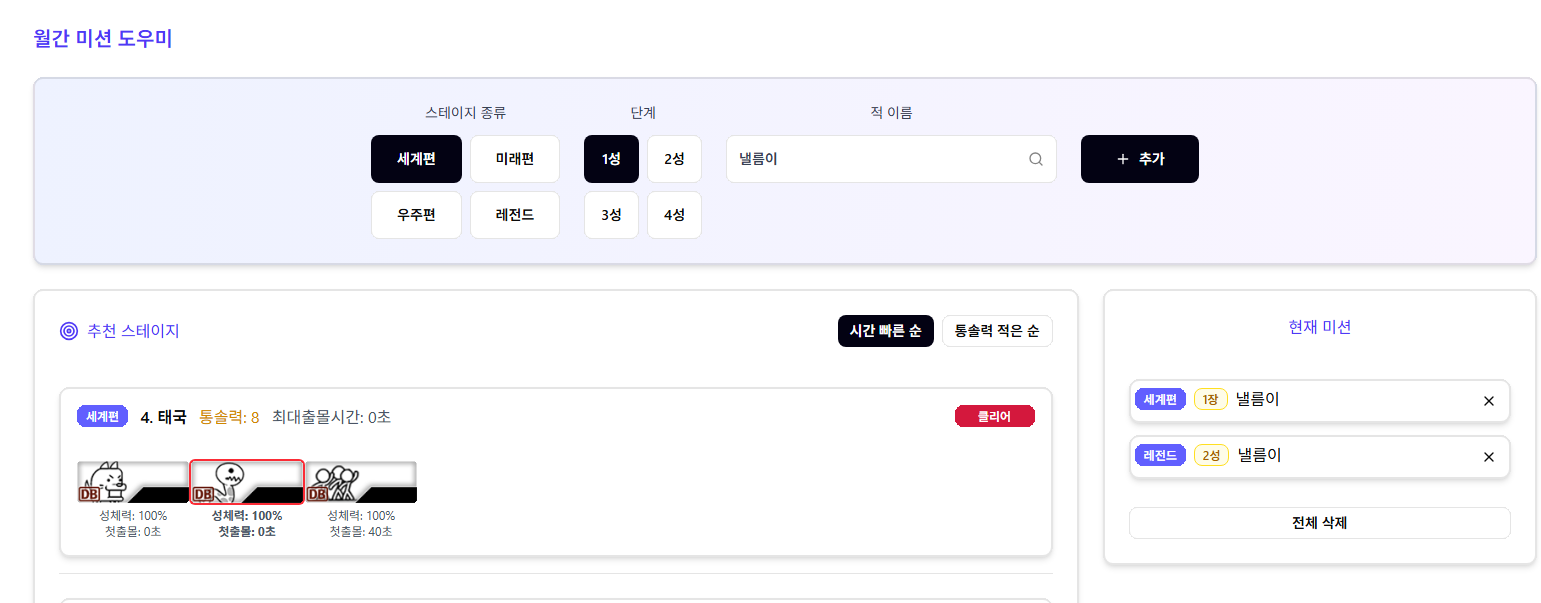 - 필터에서 스테이지 종류와, 단게(1성 2성 3성 -> 1장 2장 3장에 대응), 적 이름을 선택하고 추가 버튼을 누르시면 해당 미션이 추가됩니다.